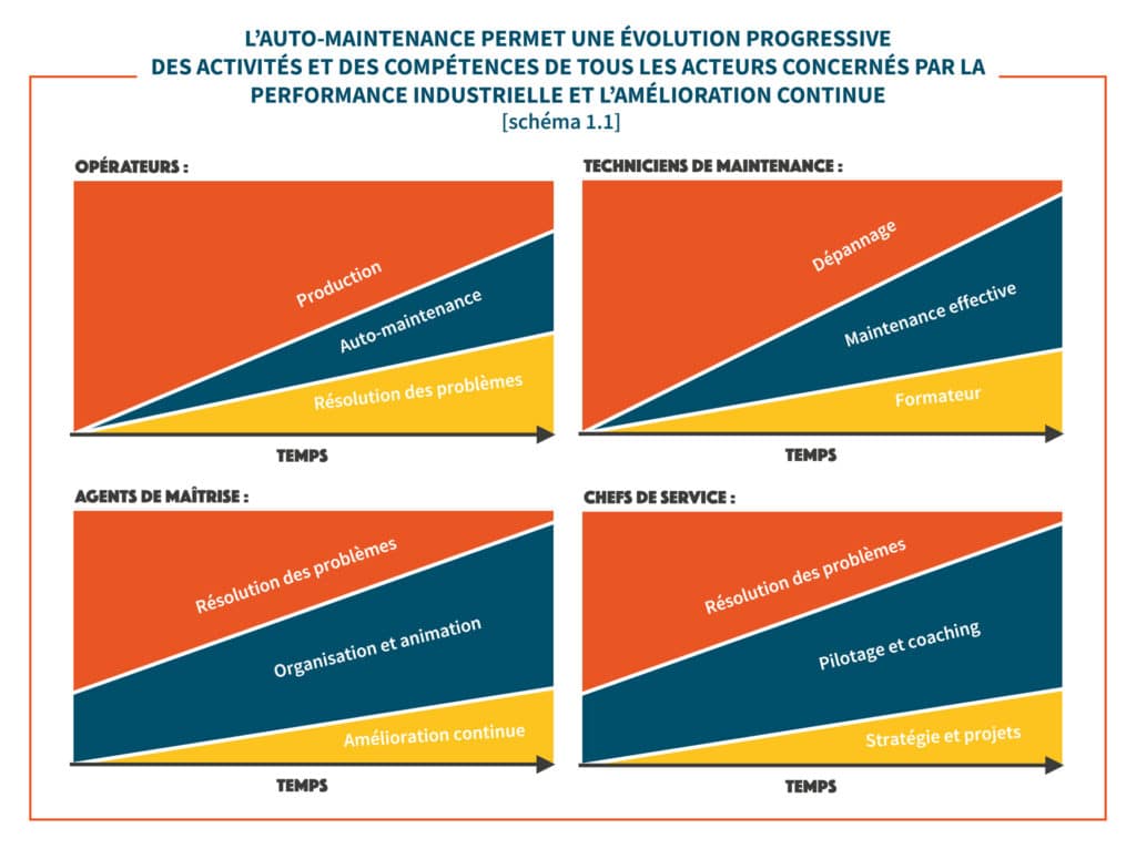 Les industriels ont tout intérêt à mettre en place une démarche d’auto-maintenance parce qu’elle permet d’améliorer les performances industrielles : fiabilité des installations, réduction des temps et nombre d’arrêts dus aux microdéfaillances, augmentation de temps de fonctionnement entre les pannes, diminution des temps d’intervention. Nous observons une nette amélioration de la disponibilité machine et une réduction des coûts de maintenance.