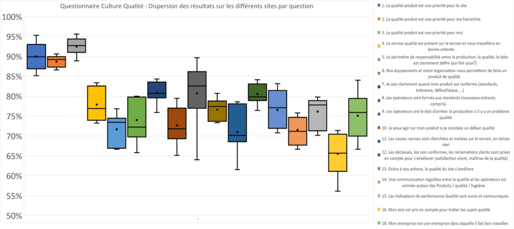 - La « boîte à moustache », un questionnaire anonymisé administré à 100 % des collaborateurs, qui permet de mesurer les écarts de perceptions entre les services, entre les niveaux hiérarchiques, entre les sites (quand multisite).