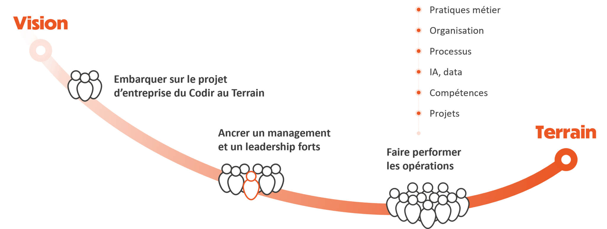 - Mobiliser du Codir au terrain : embarquer le Codir et chaque niveau autour d’un projet d’entreprise qui donne du sens et implique largement les collaborateurs.